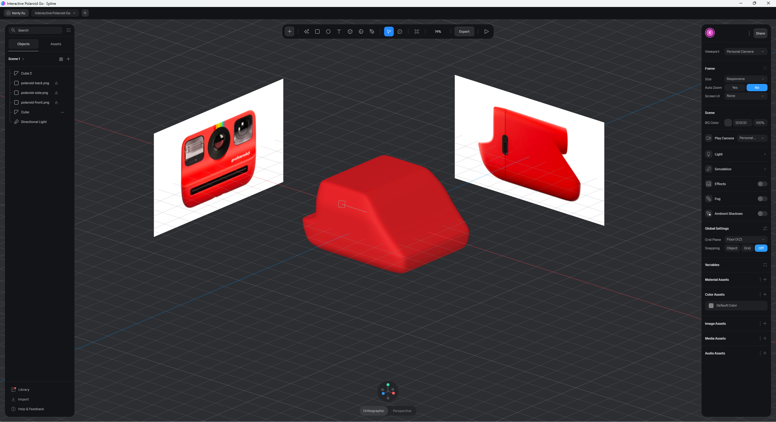 The control interface of Spline is reminiscent of Figma, with a left panel housing layers and asset libraries, a right panel for contextual settings based on the selected object, and a top toolbar offering shapes, camera, lights, and other standard 3D objects. Spline also incorporates components and variable features akin to Figma, enabling users to create reusable components, publish assets in libraries, and share them with teams.